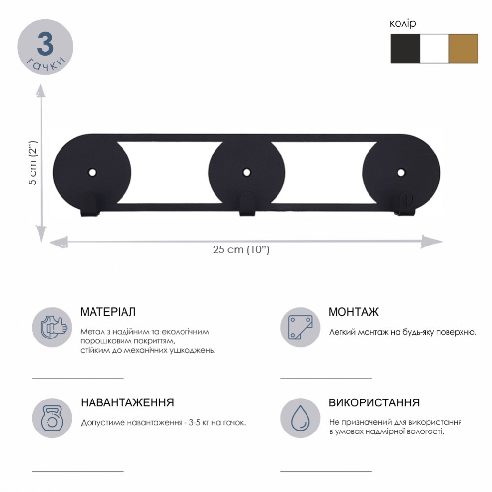 Порошкове покриття гарантує рівномірний колір вішака, а також стійкість до механічних пошкоджень. Вішалки і гачки поставляються з усією необхідною фурнітурою для монтажу.Характеристики