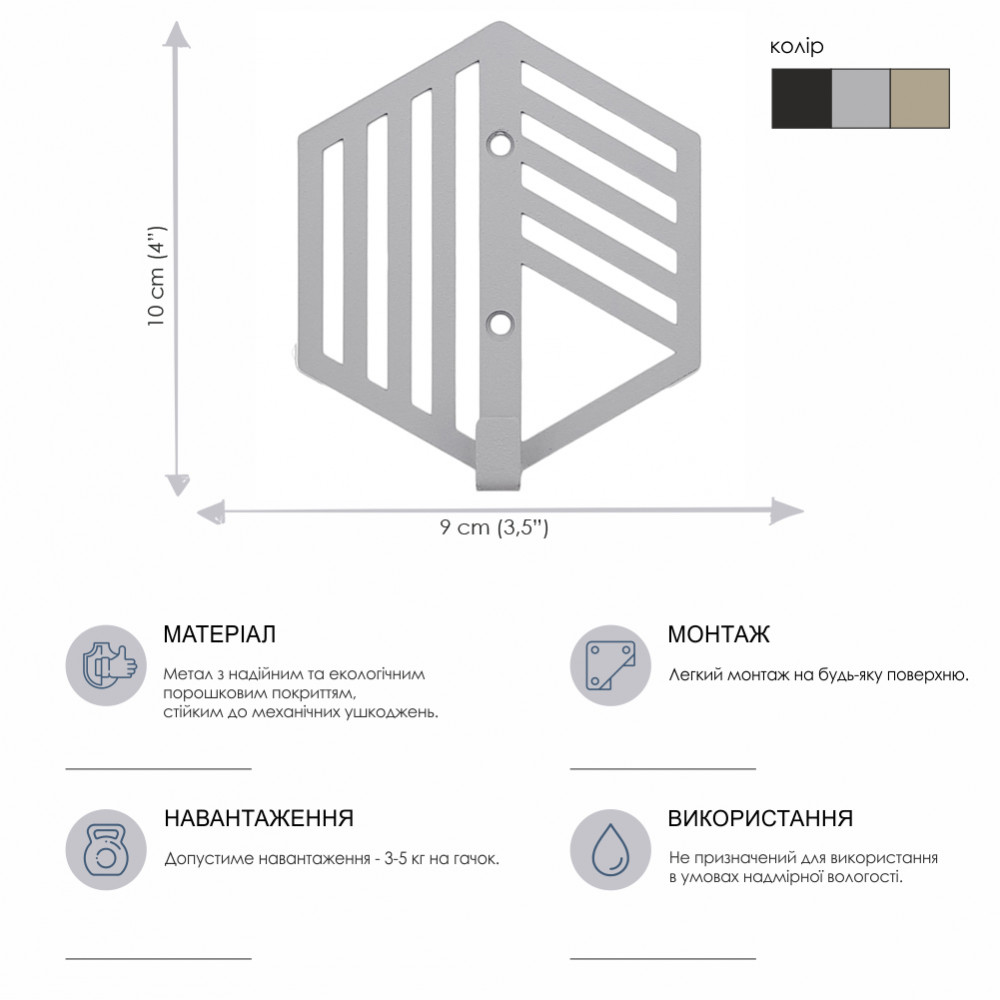 Порошкове покриття гарантує рівномірний колір вішака, а також стійкість до механічних пошкоджень. Вішалки і гачки поставляються з усією необхідною фурнітурою для монтажу.Характеристики