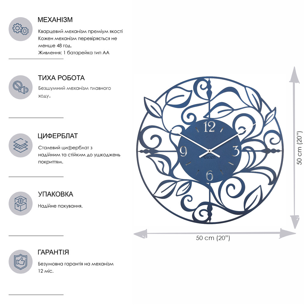 Оригінальний настінний годинник Glozis виконаний зі сталі. Порошкове покриття, яке гарантує однорідний і насичений колір циферблату, забезпечує максимальну екологічність продукції! Дизайнерський настінний годинник оснащений кварцовим безшумним годинниковим механізмом.