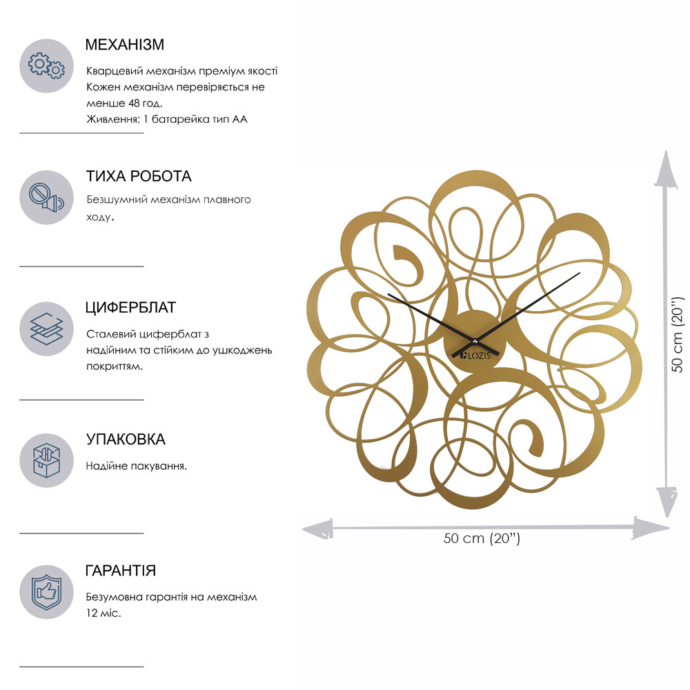 Оригінальний настінний годинник Glozis виконаний зі сталі. Порошкове покриття, яке гарантує однорідний і насичений колір циферблату, забезпечує максимальну екологічність продукції! Дизайнерський настінний годинник оснащений кварцовим безшумним годинниковим механізмом.