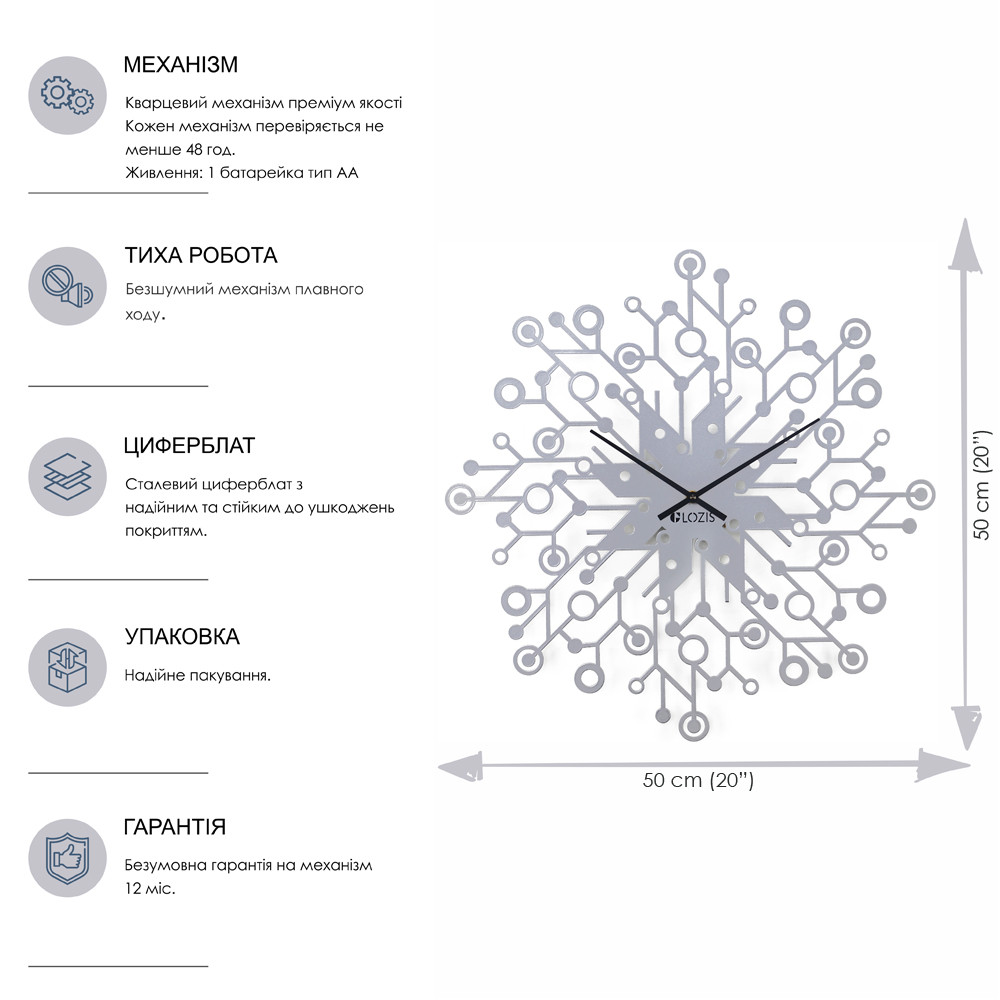 Оригінальний настінний годинник Glozis виконаний зі сталі. Порошкове покриття, яке гарантує однорідний і насичений колір циферблату, забезпечує максимальну екологічність продукції! Дизайнерський настінний годинник оснащений кварцовим безшумним годинниковим механізмом.