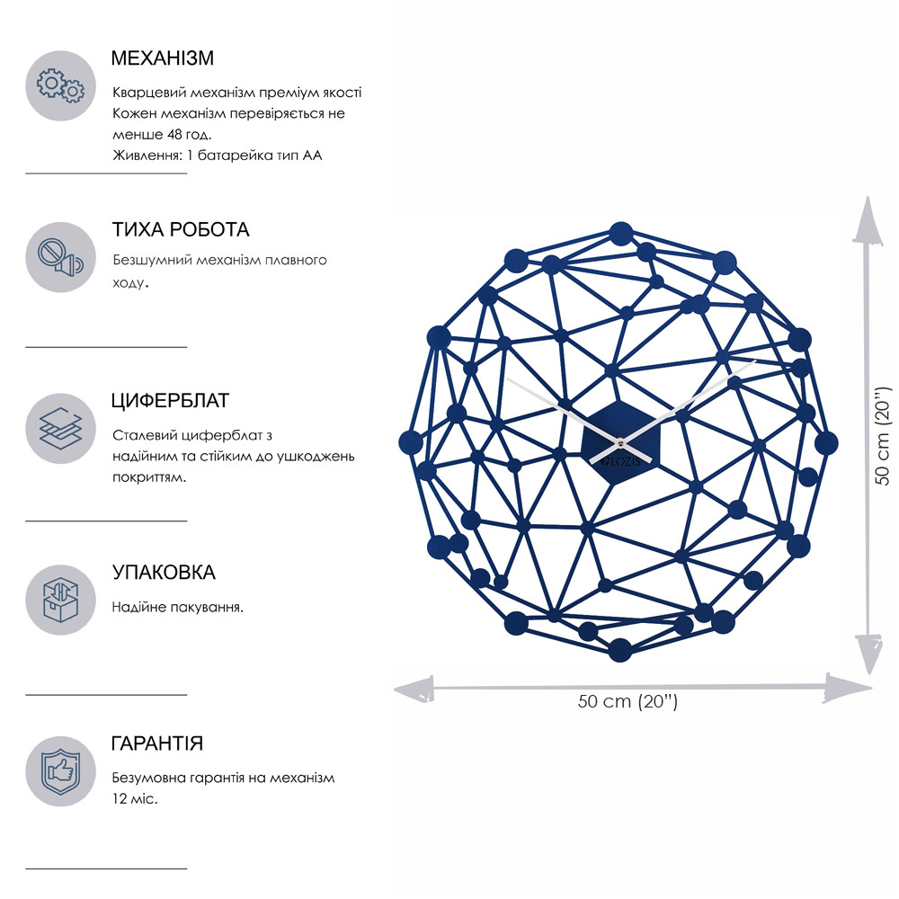 Оригінальний настінний годинник Glozis виконаний зі сталі. Порошкове покриття, яке гарантує однорідний і насичений колір циферблату, забезпечує максимальну екологічність продукції! Дизайнерський настінний годинник оснащений кварцовим безшумним годинниковим механізмом.