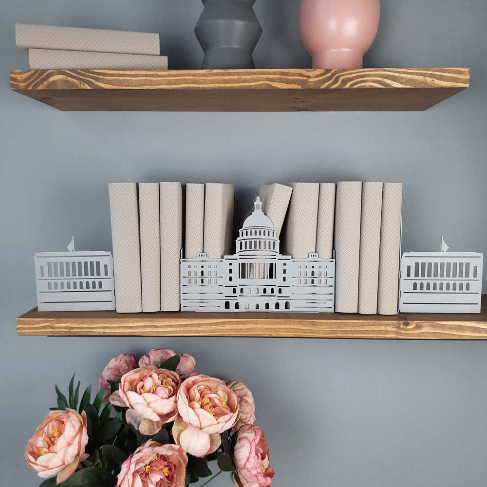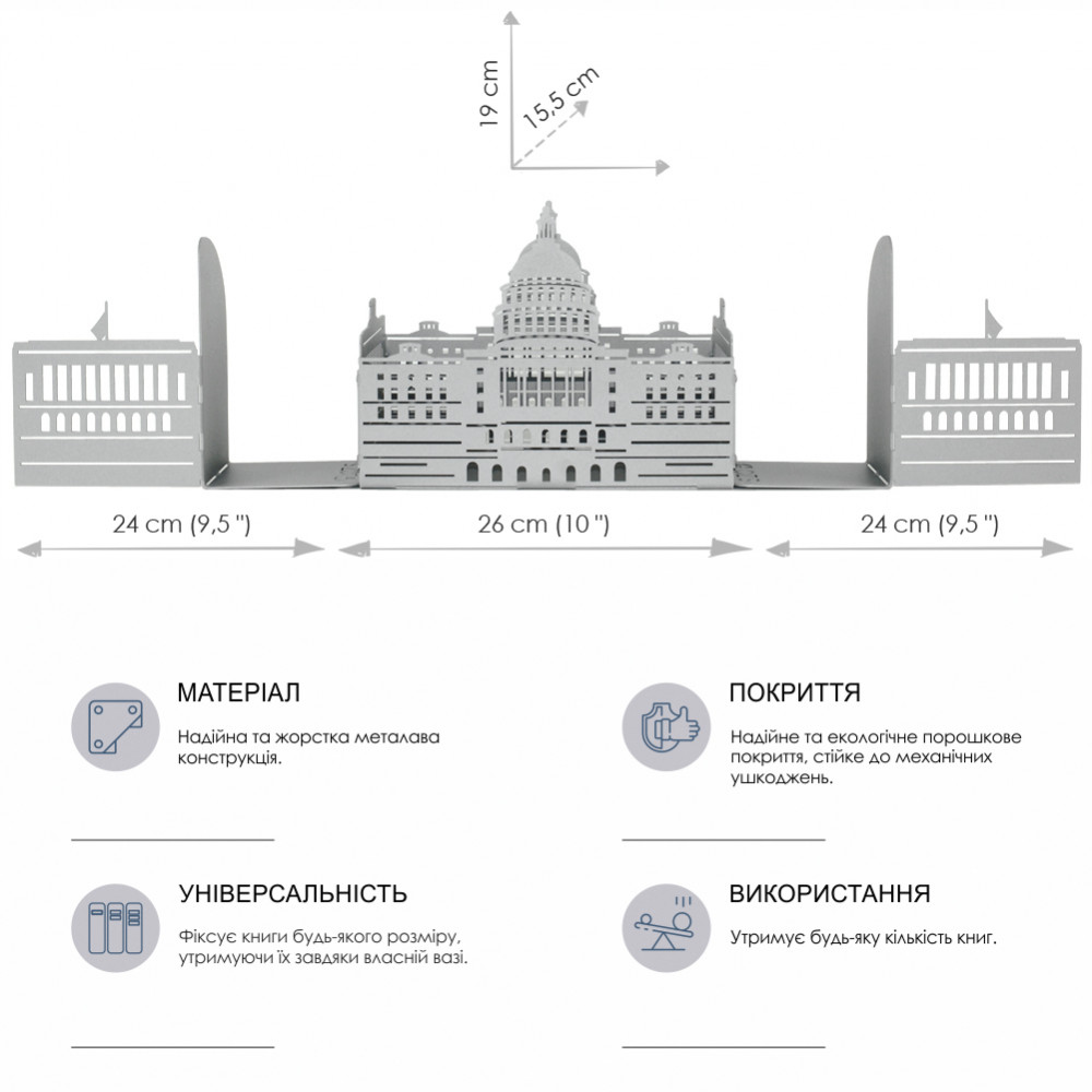 Дана конструкція упорів для книг із трьох секцій з легкістю виконує свою функцію тримачів для книг практично будь-якого формату та кількості, фіксуючи їх у потрібному положенні. Центральна частина універсальна і підходить не тільки для зберігання книг, журналів та щоденників, а й може бути своєрідним органайзером.