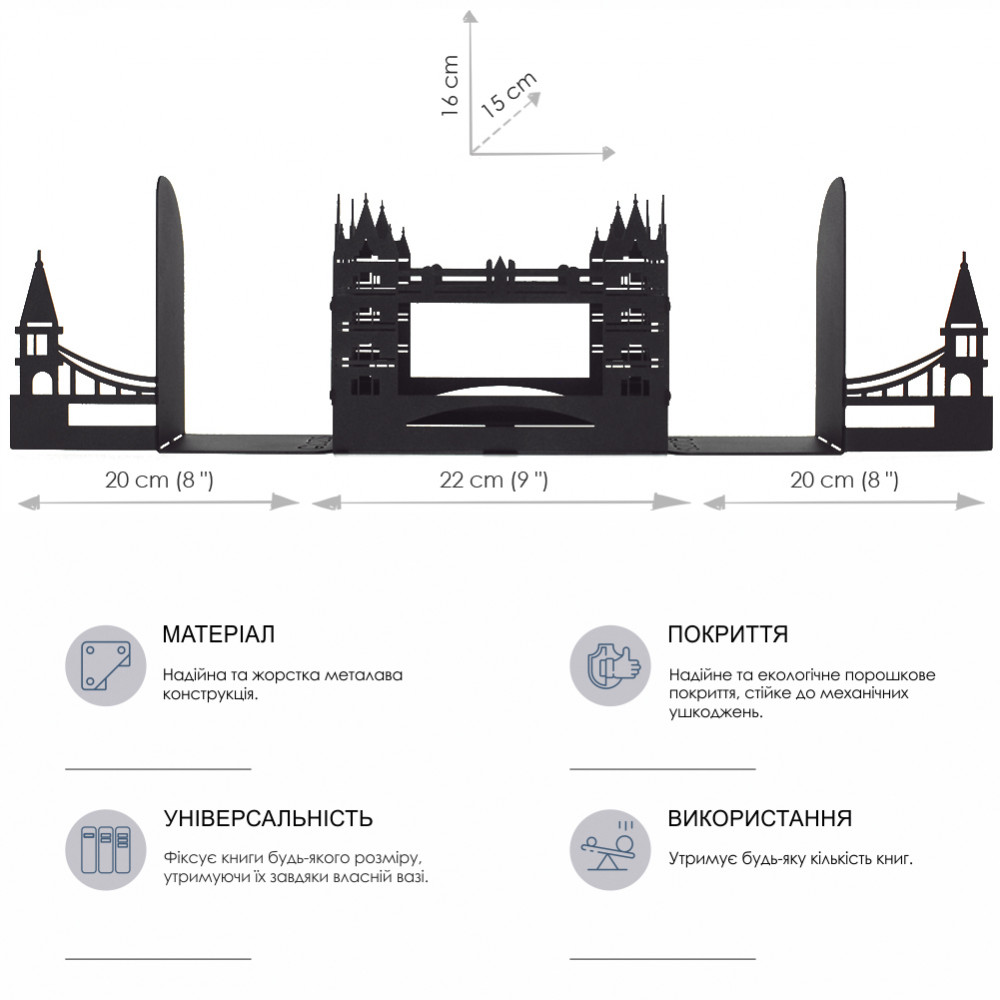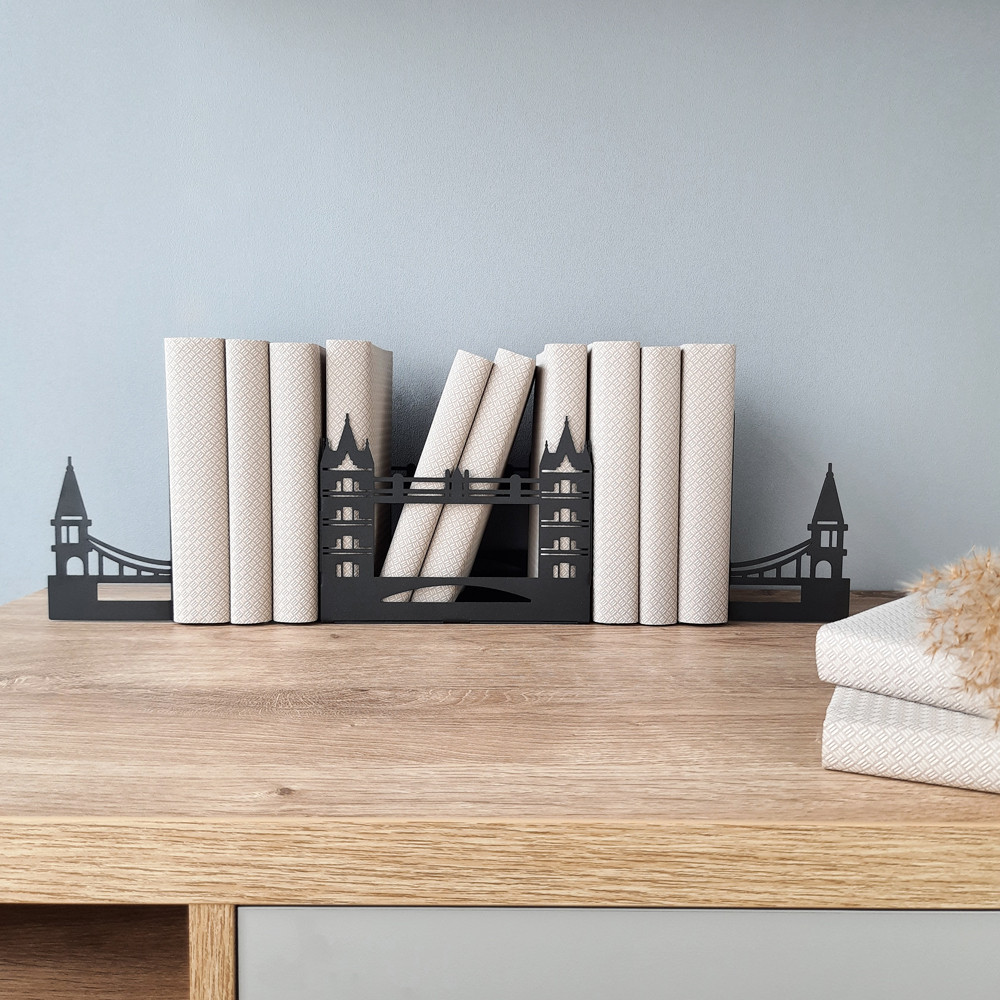 Дана конструкція упорів для книг із трьох секцій з легкістю виконує свою функцію тримачів для книг практично будь-якого формату та кількості, фіксуючи їх у потрібному положенні. Центральна частина універсальна і підходить не тільки для зберігання книг, журналів та щоденників, а й може бути своєрідним органайзером.