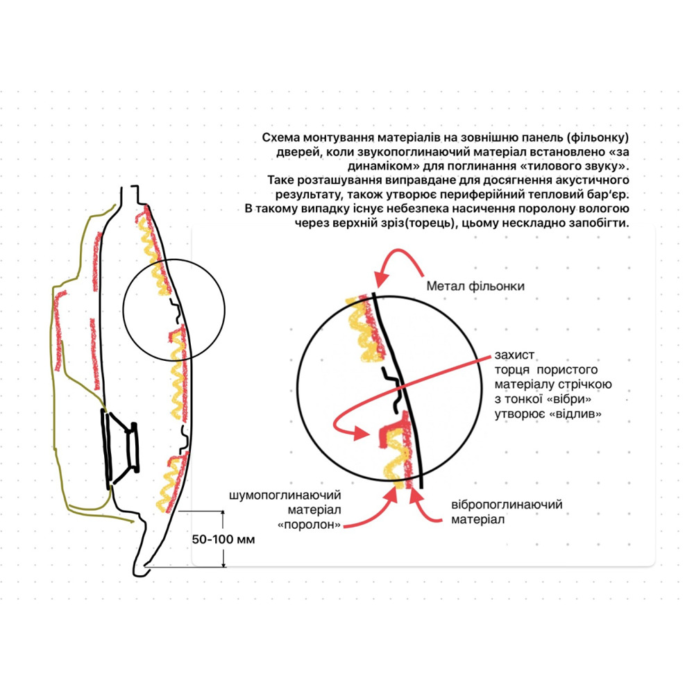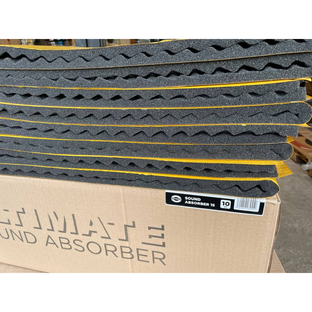 ULTIMATE SOUND ABSORBER 15 мм - шумопоглинаючий матеріал на основі спеціальних пінополіуретанів. Має пірамідальну лицьову поверхню, що значно збільшує ефективну площу і дозволяє набагато краще поглинати та розсіювати шум у великому діапазоні частот. Подібні матеріали використовуються при обладнанні звукозаписних студій. Застосовується для досягнення максимального результату якості звуку при установці акустики. Збільшена площа поглинання та товщина матеріалу, дозволяє ефективно поглинати звуки середніх та високих частот. Найкращий результат досягається при використанні ULTIMATE Sound Absorber 15 мм разом з вібропоглинаючими та бар'єрними матеріалами. Шумопоглинач не ускладнює складання салону, не має запаху і не фарбує панелі та автотканини. Акрилове просочення робить матеріал стійким та довговічним.