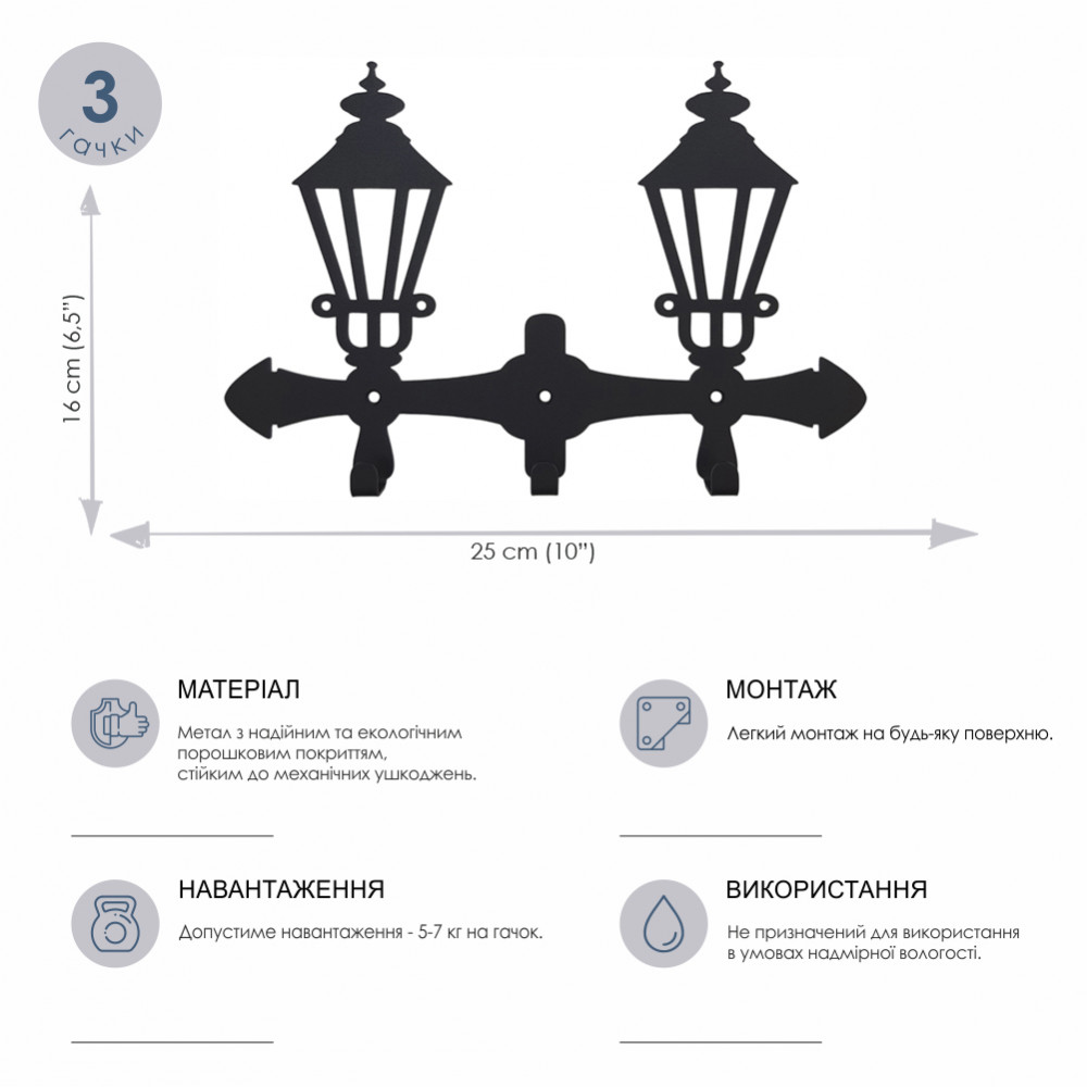 Порошкове покриття гарантує рівномірний колір вішака, а також стійкість до механічних пошкоджень. Вішалки і гачки поставляються з усією необхідною фурнітурою для монтажу.Характеристики