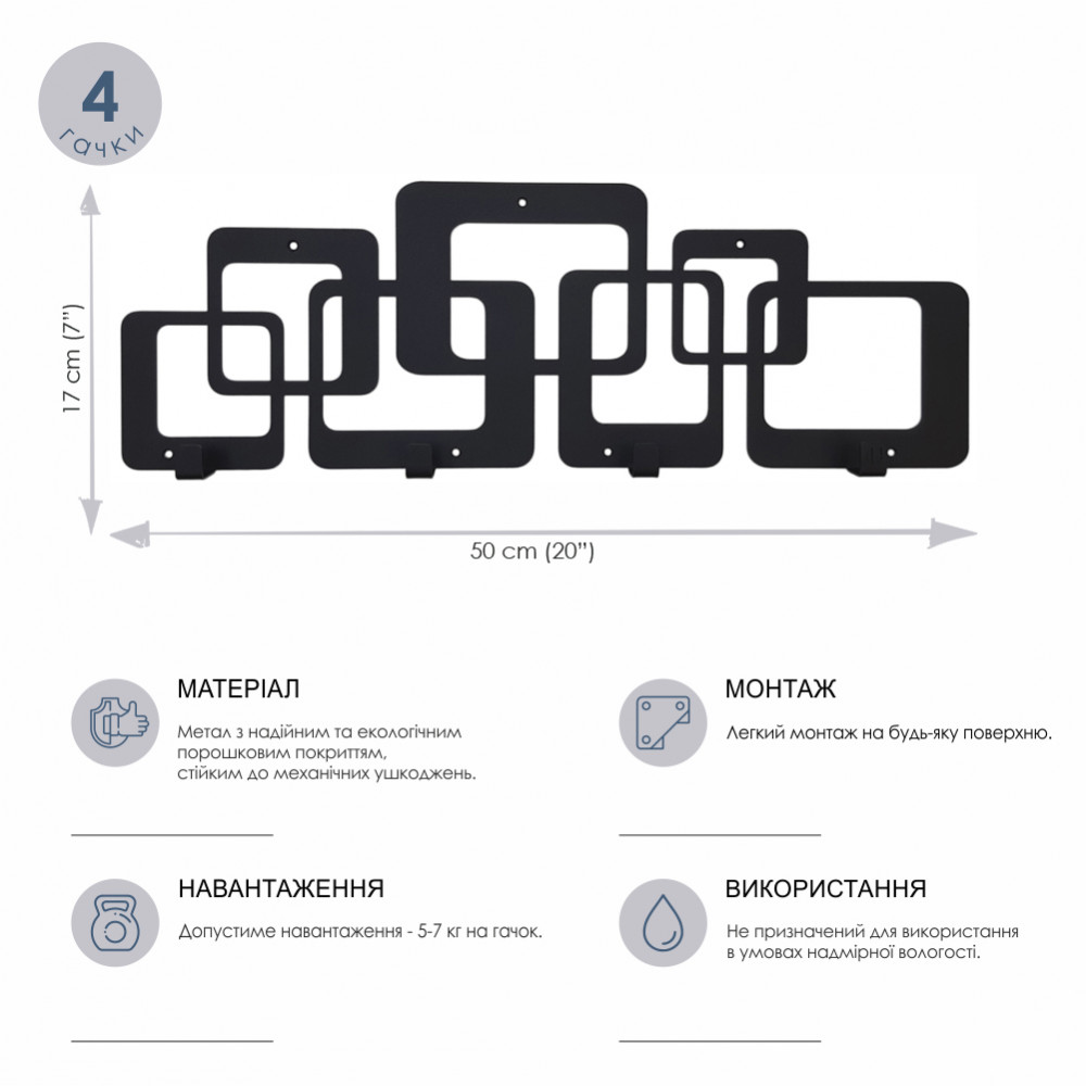 Порошкове покриття гарантує рівномірний колір вішака, а також стійкість до механічних пошкоджень. Вішалки і гачки поставляються з усією необхідною фурнітурою для монтажу.Характеристики