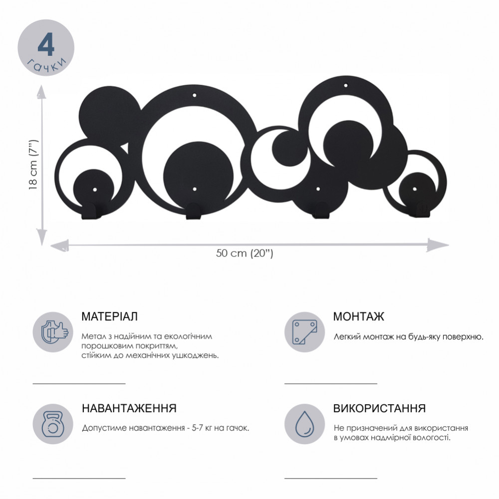 Порошкове покриття гарантує рівномірний колір вішака, а також стійкість до механічних пошкоджень. Вішалки і гачки поставляються з усією необхідною фурнітурою для монтажу.Характеристики