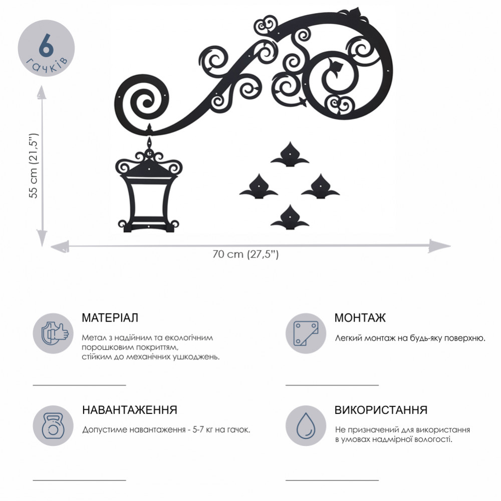 Порошкове покриття гарантує рівномірний колір вішака, а також стійкість до механічних пошкоджень. Вішалки і гачки поставляються з усією необхідною фурнітурою для монтажу.Характеристики