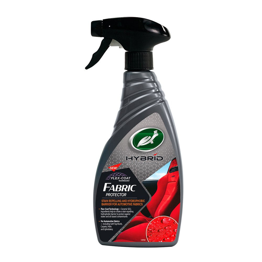 Засіб для захисту текстилю з керамікою Turtle Wax HS FABRIC PROTECTOR відноситься до нової революційної лінійки продуктів Turtle Wax Hybrid Solutions. Цей засіб є інноваційним продуктом, що використовується для захисту текстильних поверхонь – килимки, сидіння, карти дверей тощо. Технологія FLEX-COAT включає в себе інгредієнти діоксиду кремнію SiO2, що проникають у волокна і створюють гідрофобний бар'єр, що відштовхує різні забруднення на водній та масляній основі (наприклад спричинених пролиттям напоїв та їжі, таких як кава, чай, газовані напої, шоколад та випічка тощо) для зовнішніх (дах кабріолетів) та внутрішніх автомобільних тканин (включаючи мохер, брезент і сучасні тканини).Переваги Засіб для захисту текстилю з керамікою Turtle Wax HS FABRIC PROTECTOR:∙ революційна лінійка продуктів Turtle Wax Hybrid Solutions;∙ кераміка та графен захищають текстильні волокна від подальших забруднень;∙ технологія FLEX-COAT забеспечує проникнення засобу вглиб волокон;Застосування Засіб для захисту текстилю з керамікою Turtle Wax HS FABRIC PROTECTOR:1. Попередньо очистіть текстильні поверхні від бруду, жиру та інших забруднень (наприклад сухою хімчисткою Turtle Wax INTERIOR 1).2. Висушіть поверхні після чистки.3. Добре збовтайте засіб перед використанням.4. Рясно нанесіть засіб на поверхні з відстані 10-15 см.5. При надлишковому нанесенні чистою мікрофіброю приберіть залишки засобу.6. Обов’язково дочекайтесь повного висихання тканини, щоб графен та кераміка полімеризувались. Після чого поверхня набуде гідрофобних властивостей. Поради виробника: перед використанням добре струсіть флакон. Не використовуйте під прямими сонячними променями та на гарячій поверхні. Після нанесення не мочіть ділянки на протязі 1-2 годин для полімеризації керамічного покриття.Зберігання та догляд: зберігайте продукт у межах від 0 ºC до +40 ºC градусів. Не допускайте зберігання під прямими сонячними променями або поблизу гарячих поверхонь. Не допускайте замерзання продукту.